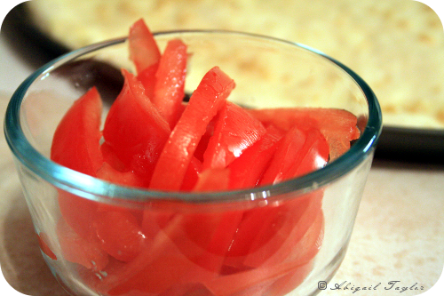 14. Arrange tomato slices on top of the pizza.